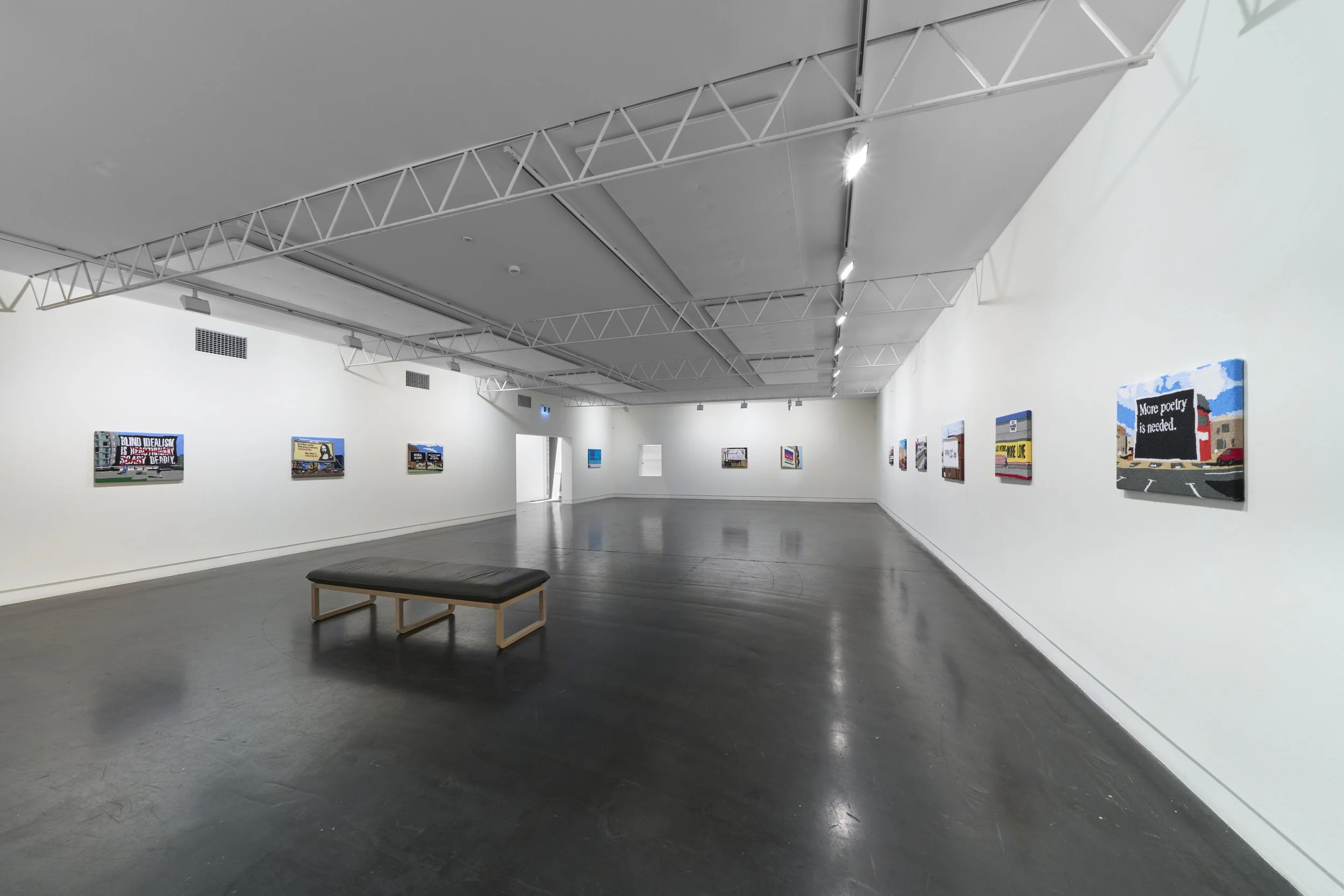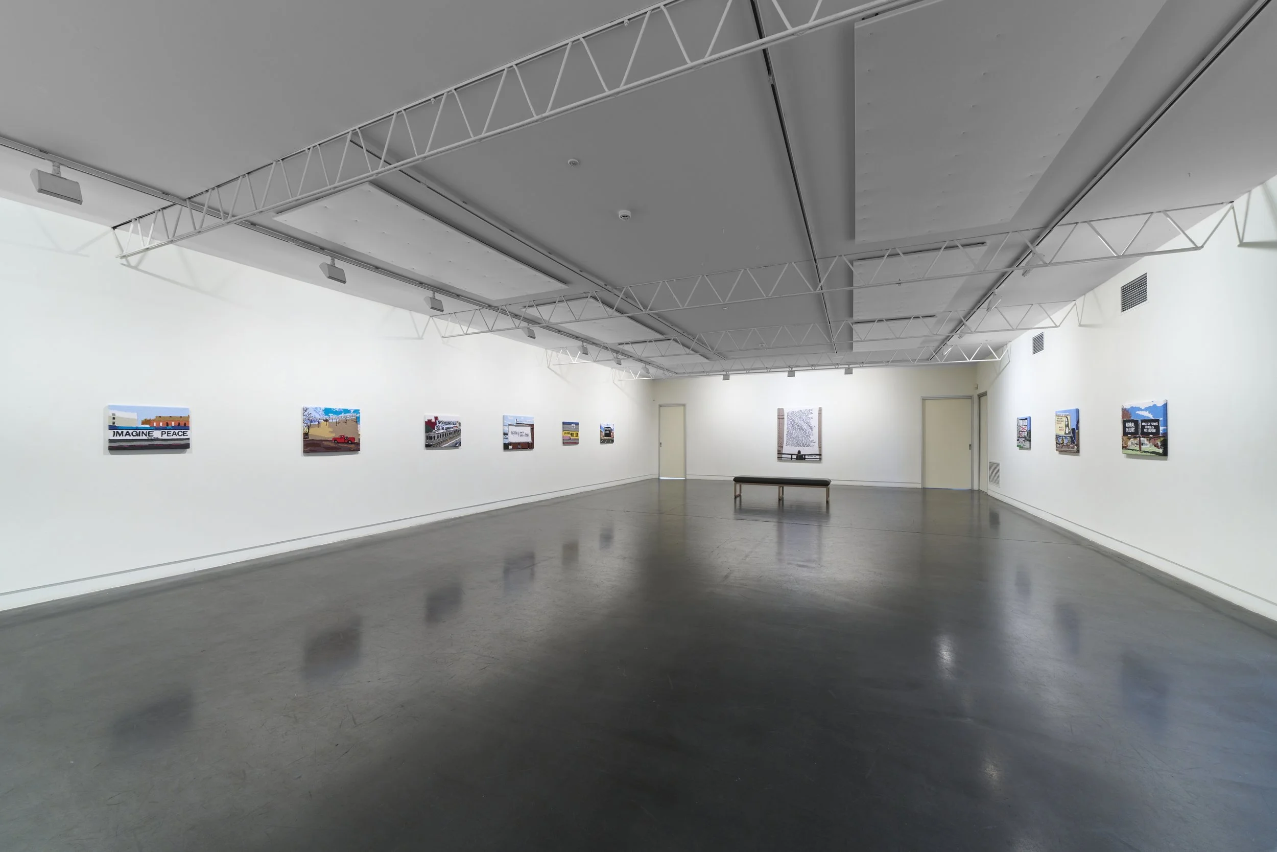 The works offer a curated glimpse of public sign artworks that span over thirty years. Ten of the artists I paid homage to have installed their sign artworks in the United States. I was born and raised in Connecticut and lived the first twenty-one years of my life in the USA. This selected body of artworks reflects on the USA’s continuing dominating influence on global politics, the current political crisis there, and the strong influence of many pop and political artists on my own art practice.