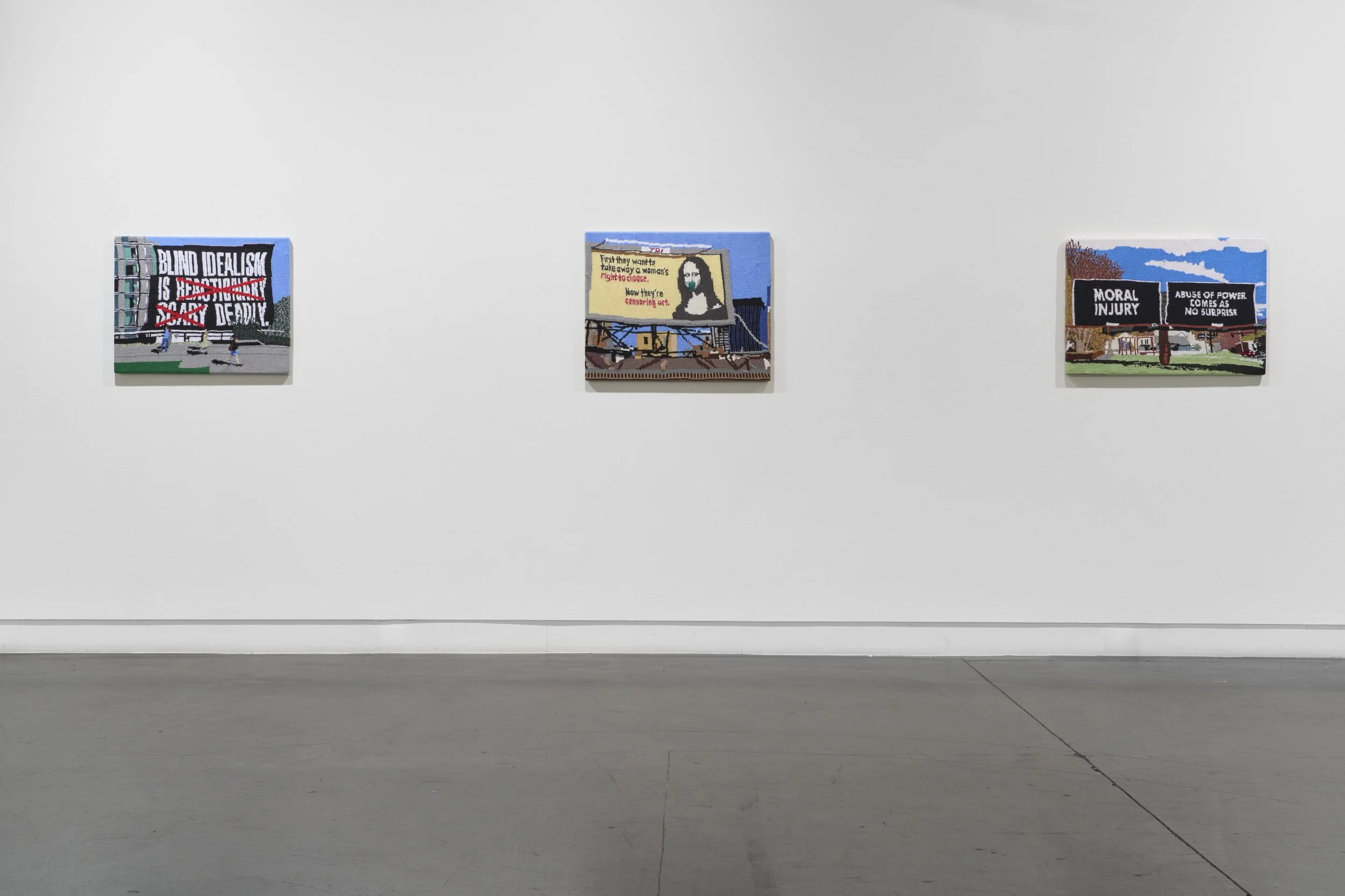 A Sign of the Times features a series of thirteen hand knitted translations I created to pay homage to potent text-based, political, public signs by other artists that still resonate in our current political and social climate. I cast in knitting, famous text-based signs by artists Jeremy Deller, David McDiarmid, Barbara Kruger, Yoko Ono, Susan O’Malley, Zoe Leonard, the Guerrilla Girls, Felix Gonzalez Torres, Jenny Holzer, Damian DinéYazhi, Alyson Provax, Robert Montgomery, and Steve Powers.